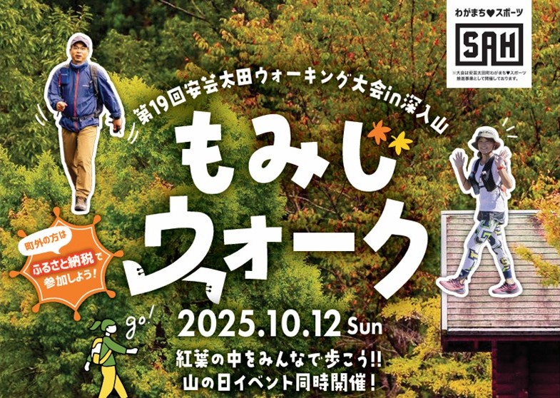 令和7年10月12日(日)に第19回安芸太田ウォーキング大会in深入山「もみじウォーク」開催します。例年のコース(3㎞、10㎞、20㎞)に加え、新たに6㎞コースが追加となりました。ご参加お待ちしております。