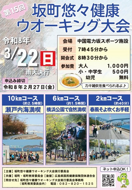 イベント情報 2026.01.19 第15回坂町悠々健康ウオーキング大会 オーキング大会 坂町で、ウォーキング大会が開催されます。 ご自分のペースに合わせて、コースの選択が可能です。 春の訪れを感じる心地よい季節に、ぜひ参加してみませんか。 お申込み、詳細については、下記のチラシをご参照ください。 日時 令和8年3月22日(日) (受付開始7:45~) 会場 中国電力坂スポーツ施設(安芸郡坂町) 申し込み ● TEL 082-820-1525 ● QRコード ● e-moshicom moshicom.com/126168/ チラシ 第15回坂町悠々健康ウオーキング大会 関連リンク 第15回坂町悠々健康ウオーキング大会 関連リンク 主催 坂町教育委員会内 坂町悠々健康ウオーキング大会実行委員会