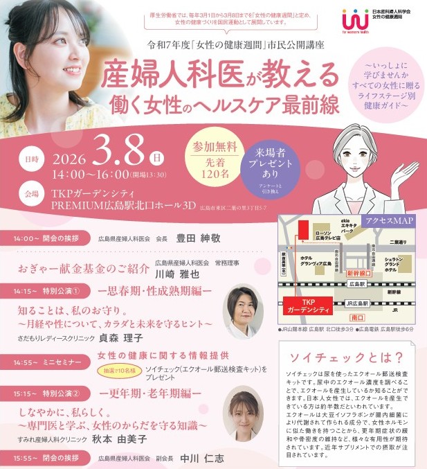 広島県産婦人科医会などの共催による市民公開講座が開催されます。思春期から更年期まで、女性のライフステージに応じた健康課題を専門医がわかりやすく解説する内容で、月経や性の基礎知識、女性のからだを守るためのポイントなどが学べます。医師による講演に加え、企業による健康情報の提供も行われ、女性の健康を幅広く考える機会となっています。ぜひご参加ください。
